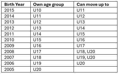 The official championship age groups begin at u11 and run right through to u19 for juveniles. Though counties and some provinces run competitions for u9s and 10s too. Athletes run in their own age group and can move up one age. This is to help form teams. To simplify things refer to the table below;