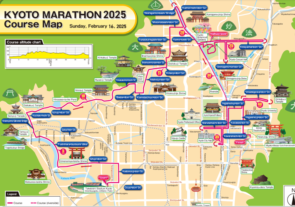 The Kyoto Marathon kicks off at 9:00 a.m. from Takebishi Stadium, offering runners a chance to explore the historical and cultural beauty of one of Japan's most iconic cities. The course winds through some of Kyoto’s most renowned landmarks, making this race a unique journey through centuries of tradition and stunning natural beauty.