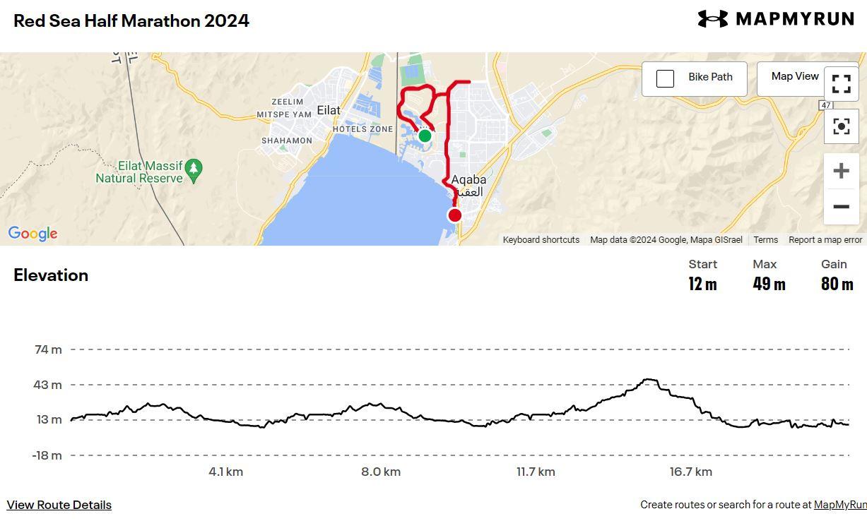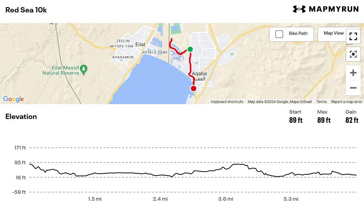 The Red Sea Half Marathon kicks off from just outside the Hyatt Regency Hotel, with runners taking on two laps around the peaceful Ayla Oasis. While the course map isn’t available on the organisers’ website, I’ve roughly plotted it based on the provided route description. The elevation, however, is fairly straightforward, gentle and flat for the most part, with only a few minor inclines to keep things interesting.