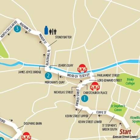 A swift right turn takes you onto the South Circular Road, where relief awaits in the form of a water station, first aid, and toilet facilities. You’re now headed towards Saint James's Hospital, which is either a reassuring sight or an ominous one, depending on how you're feeling after the 12 mile mark.