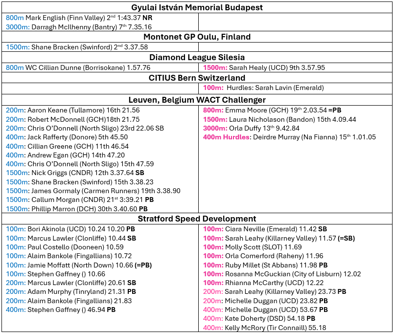 Another fantastic week at the office for our athletes engaging in competition. The week started out with that National Record by Mark English. For the third time this year he has recorded a sub 1.44 800m. Reducing his time to 1:43.47 in Budapest, the Finn Valley AC athlete is creating positive vibes in advance of next months World Championships. At the same meeting Darragh McIlhenny set a new personal best over 3000m of 7:35.16 moving him to number 5 on the all-time list. It is a waiting game to see if the Bantry athlete still remains within the quota for the World Championships in Tokyo.