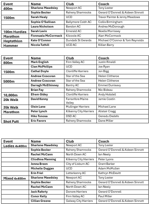 Included in the team are the three marathon runners; Peter Lynch (Kilkenny City Harriers). Hiko Tonosa (DSD) and Fionnuala McCormack (Kilcoole). Lynch is the current Irish marathon record holder and will compete in his first world championships. Tonosa the previous record holder, won the 2024 Dublin City Marathon. Five-time Olympian Fionnuala McCormack is competing in her first World Championships since Degu in 2011, where she then completed in the Steeplechase.